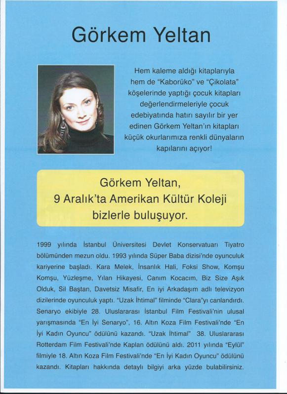 Öğrencilerimizin okuma sevgisini geliştirmek, çocuk kitaplarının edebi temellerini oluşturması, nitelikli okumanın ve yazmanın gerçeklemesine katkı sağlaması amacıyla, öğrencilerimizi 9 aralık 2014 Salı günü yönetmen, oyuncu aynı zamanda da çocuk yazarı olan Görkem YELTAN’la buluşturacağız. Yazarımız, öğrencilerimizin okuduğu şahsına ait kitapları imzalayarak onlarla söyleşi yapacak aynı zamanda da onlarla birlikte hikaye yazma atölye çalışması yapacaktır.